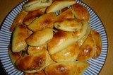 6. Etalez la pâte sue 2 ou 3mm d’épaisseur. Découpez des formes circulaires de 10 à 15 cm de diamètre. Mettez un peu de farce au milieu de chaque morceau de pâte, repliez, pincez les bords pour les souder, disposez les pirojki sur une plaque beurrée et farinée et mettez au four (th 7-8, 250°) pour 5 à 7 minutes. Baissez le four (th 6, 210°) et laissez cuire encore 5 à 7 mn. Les pirojki doivent être bien dorés.